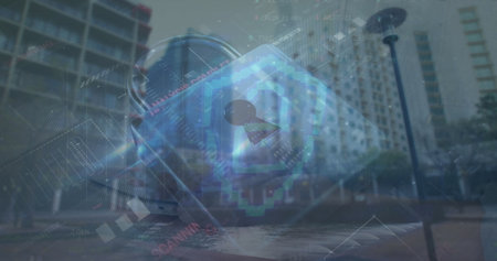 Virtual creative lock symbol and microcircuit illustration on office buildings background. Protection and firewall concept. Multiexposure