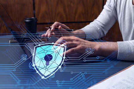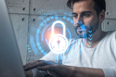 A serious caucasian programmer in casual wears, using laptop to develop a new security system to protect data. Double exposure. IT lock hologram icon.