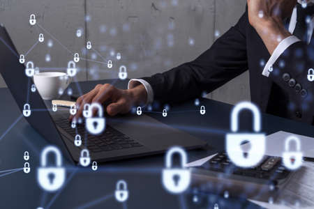 A programmer is typing a code on computer to protect a cyber security from hacker attacks and save clients confidential data. Padlock Hologram icons over the typing hands. Formal wear.