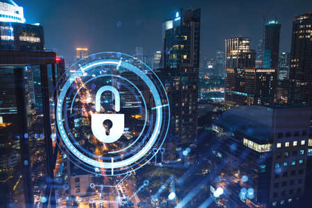 Glowing Padlock hologram, night panoramic city view of Bangkok, Southeast Asia. The concept of cyber security to protect companies. Double exposure.