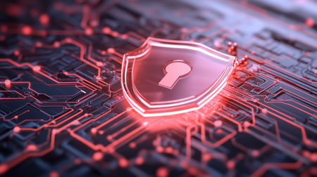 A luminous padlock on a shield symbolizes robust cybersecurity, set against a sleek, high-tech network backdrop evoking advanced digital protection.