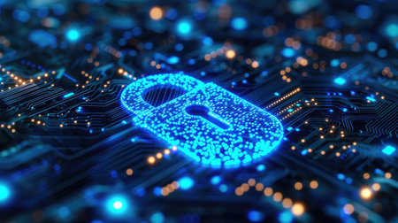 A conceptual image showcasing digital security on a circuit board, featuring a prominent lock symbol. This reflects the importance of data protection and encryption in modern technology.