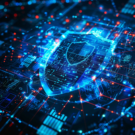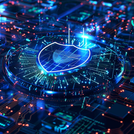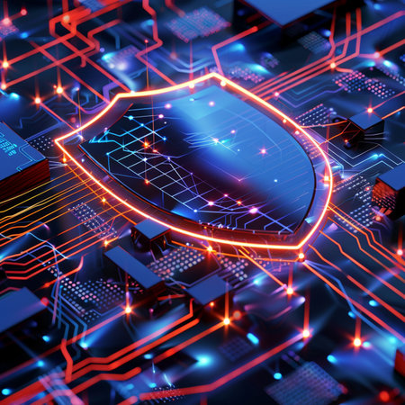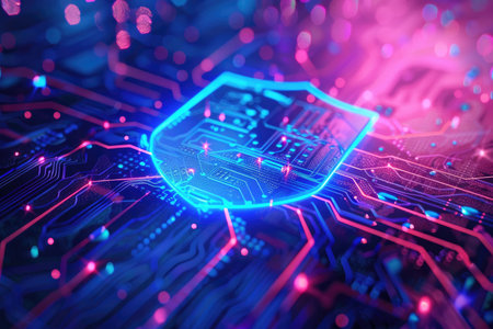 A stylized digital shield with glowing neon lines hovering over a circuit board.