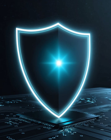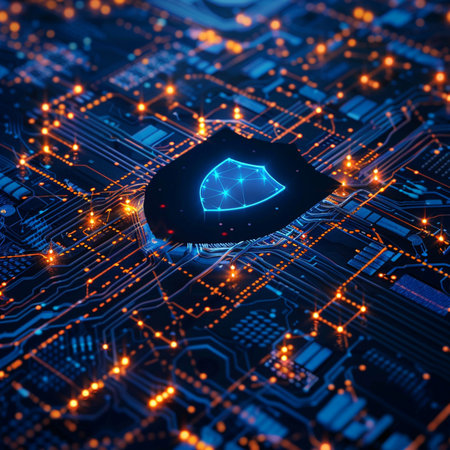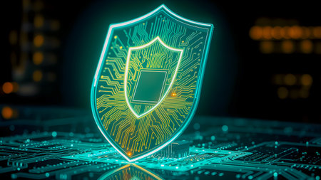 A close-up view of a glowing digital shield on a complex circuit board, symbolizing the importance of cybersecurity and data protection in today's technology-driven world.