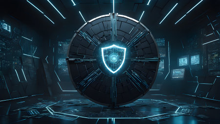 An artistic rendering presents a shield emblem featuring a prominent lock symbol. The composition emphasizes digital security through its dark tones and futuristic aesthetic. The image uses contrasting red and blue highlights, suggesting an advanced technological environment. Suitable for illustrations concerning data protection and cyber security.