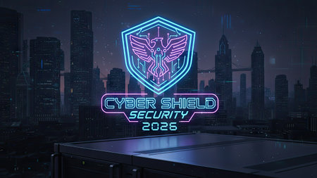 A digital graphic displays a security logo against a futuristic city backdrop. The logo features a shield, with a phoenix graphic, and illuminated neon effects. The composition utilizes dark tones and subtle lighting to provide a modern and sleek appearance. Suitable for technology, security, or corporate editorial applications.