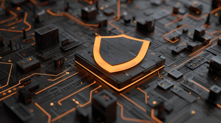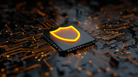This image showcases an abstract concept of cybersecurity, featuring a shield icon positioned on a circuit board with glowing orange details against a dark background.