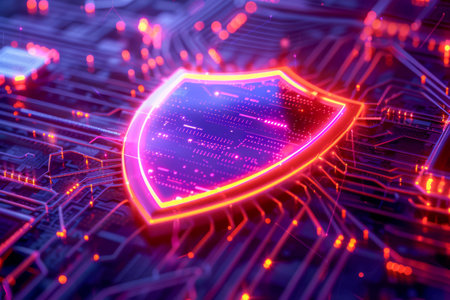 A vibrant digital shield with glowing edges stands out against a dark circuit board background. The design highlights themes of technology, cybersecurity, and protection in a modern setting