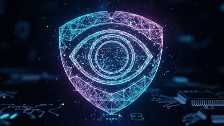 A shield with cybernetic patterns and a robotic eye represents AIs role in boosting cybersecurity and vigilance.