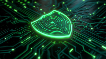 This abstract image features a glowing green shield symbol on a circuit board, embodying concepts of cyber security, protection, and technology innovation.