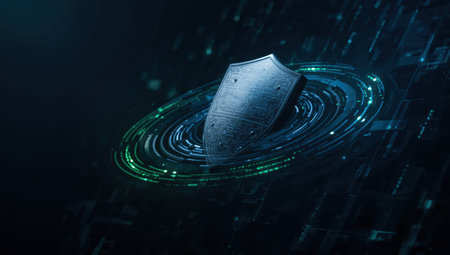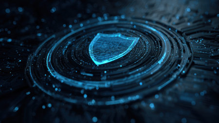 Digital shield with circuit pattern protecting data in dark cyberspace, calm secure feeling