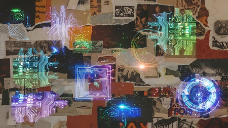 Minimalistic mixed media collage showcasing technology and vibrant textures in harmonious design