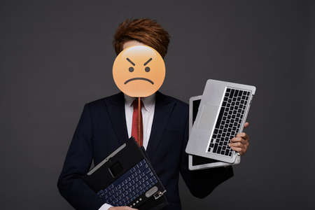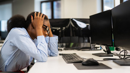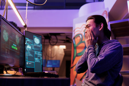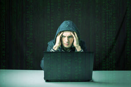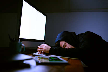 Cyber security, hacking and data analytics employee, tired from working on it, software engineering glitch. Big data, cloud computing and information technology worker with credit database hacker