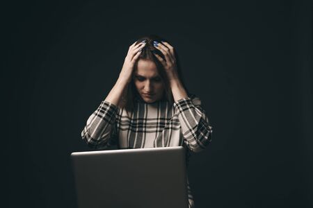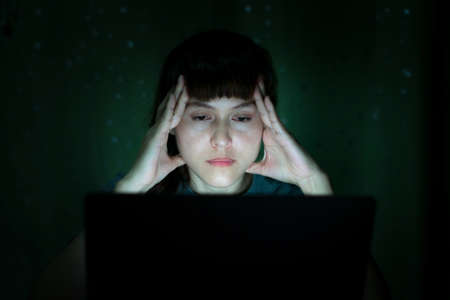 Teen girl excessively sitting at the computer laptop at home. he is a victim of online bullying Stalker social networks
