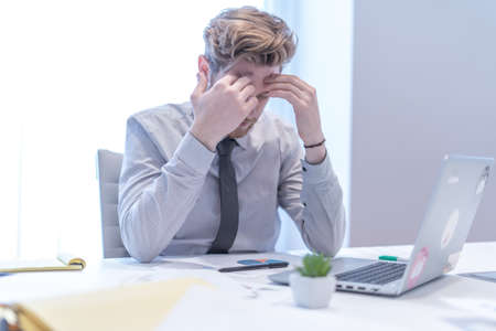 Young businessman sitting at the office table at work in depression. Problems, stress in the office, economic crisis.