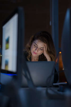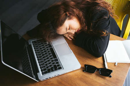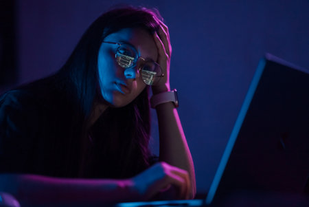 A young woman working with a laptop at night is tired, weary and sleepy. Office syndrome concept