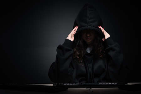 young hacker in the dark breaks the access to steal information and infect computers and systems. concept of hacking and cyber terrorism