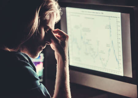 Serious business man trader analyst looking at a computer monitor, investor broker analyzing indexes, financial chart trading online investment data on cryptocurrency stock market graph on pc screen.