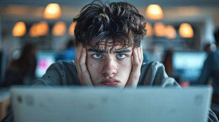 A tired young man sitting in an office in front of a computer holding head with both hands. Cyber bullying and business. High quality photo