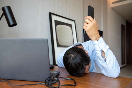 Business partners concept a male young business man sleeping on a desk with a laptop and document after working for long time.
