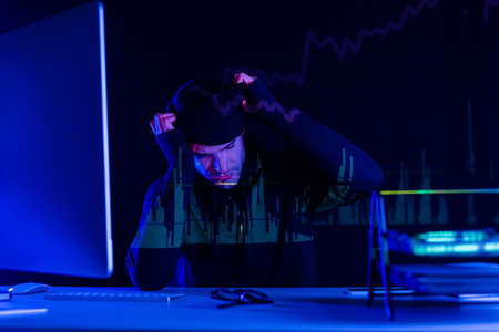 Young hacker wearing balaclava near computer and papers on black background with charts reflection