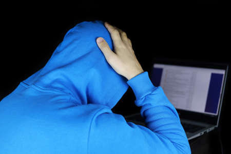 Man in blue hoodie sitting with laptop clutching his head. Concept of cybercrime, hacking, difficult task or fatal error