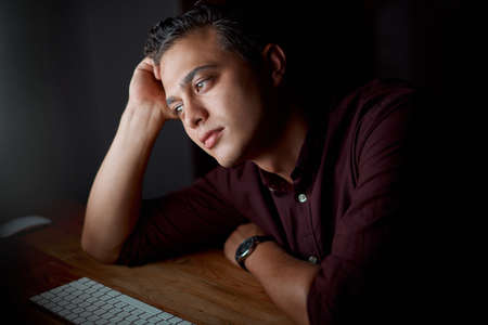 How long have I been staring at this screen now. Shot of a young businessman looking bored while working on a computer in an office at night.