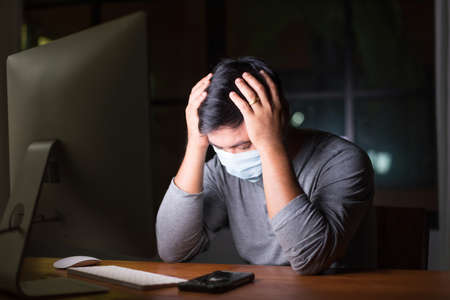 Asian man wearing preventive mask and working from home at the night time in situation of Corona Virus Disease (COVID-19). Work from home and Healthy concept