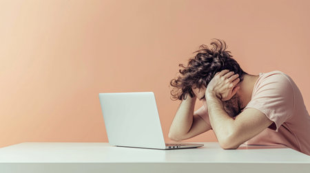 Tired and stressed young man sitting at the table with laptop, over beige background