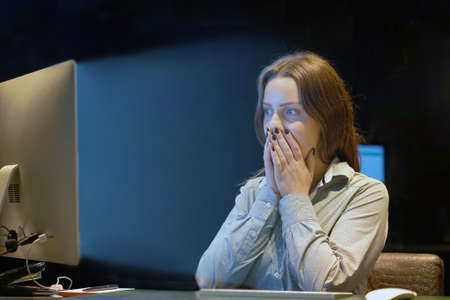 Night photo of attractive girl sitting on chair near computer in red light. Night work on the computer. Girl gamer sits at table at night and plays games on computer, looking at camera.