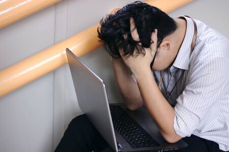 Portrait of Asian man Looked tired upset, depresssed and stressed looking at laptop, sleepy tired stress gesture, bad business pressure, work addict concept