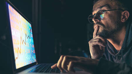Gambling addicted man with glasses in front of online casino slot machine on laptop computer at night - loosing his money. Dramatic low light grain shot.