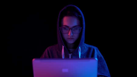 Hacker tries to break security system to steal important company information, working at laptop in blue neon light