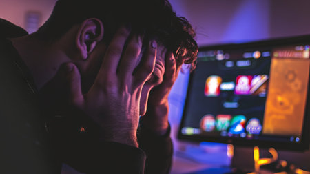 Stressed Caucasian Man Holding Head in Hands While Gaming at Night. Concept of Gamer Frustration, Online Challenges, E-sports Pressure, Gambling addiction.