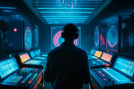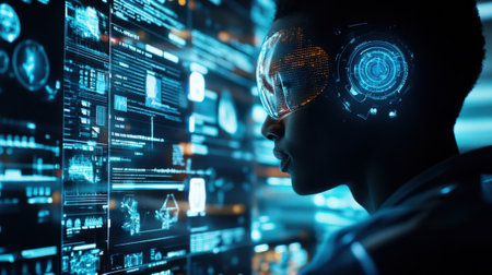 Futuristic cybersecurity analyst at work