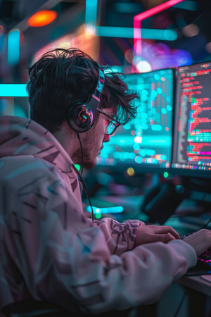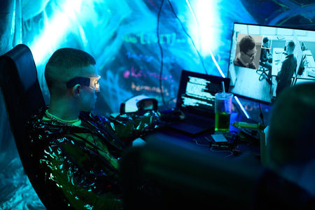 Young adult Caucasian man wearing futuristic glasses sitting at desk working on computer system, illuminated by blue neon lights, multiple monitors displaying code and footage