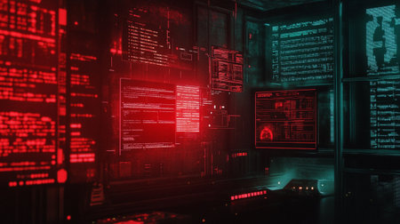 A computer screen glows with green code, complemented by red neon elements, creating a futuristic digital environment. The scene is illuminated with vibrant colors.