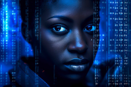 African american woman with binary code on face looking at camera on grey background, banner