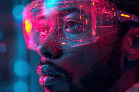 Portrait of a futuristic African American man wearing virtual reality glasses.