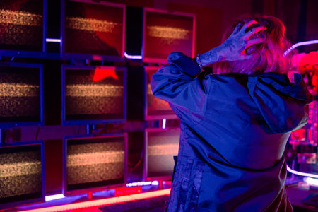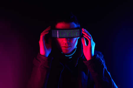 Close up view. In futuristic eyewear. Young man with curly hair is indoors illuminated by neon lighting.
