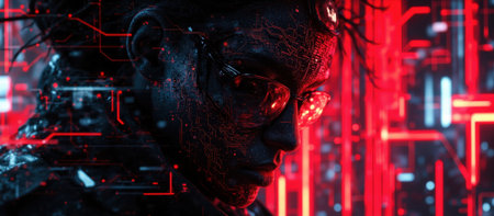 Futuristic Representation of a Person with Digital Features and Tech Patterns Highlighting Artificial Intelligence Aspects in a Dark Background