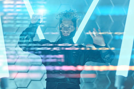 A cyberpunk warrior of the future controls a digital hologram. Game, virtual reality. Future technologies.