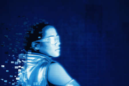 Image of futuristic woman body changing be scattering hologram particles in cyberspace