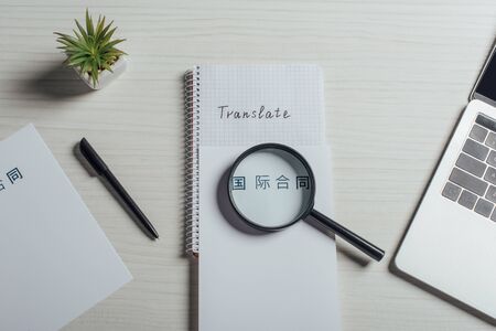 top view of hieroglyphics, magnifier and laptop on translator workplace