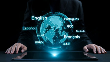 Global communication with multiple languages, digital translation tools, multilingual technology, cross-cultural communication, and virtual language learning environments.