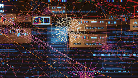 A complex web of interconnected nodes and lines on a dark background, illustrating a neural network or abstract technological concept