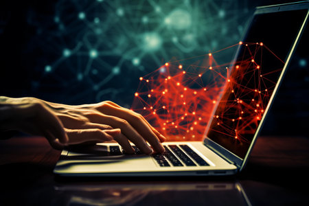 Laptop with hands of hacker and polygonal lines on dark background, view of notebook and digital data. Theme of computer technology, privacy, network, cyber security, hack, information. Generative AI