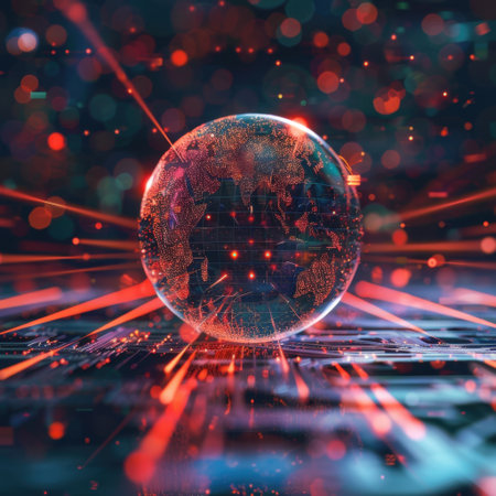 A stunning digital representation of a globe surrounded by vibrant red light effects, symbolizing technology and global connectivity. Perfect for representing innovation and digital communication.