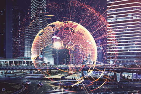 Double exposure of technology theme hologram and cityscape background. Concept of Hightech.