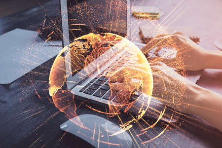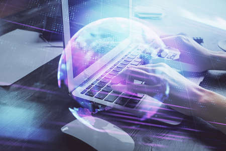 Global network concept with globe hologram on laptop keyboard for business and digital marketing